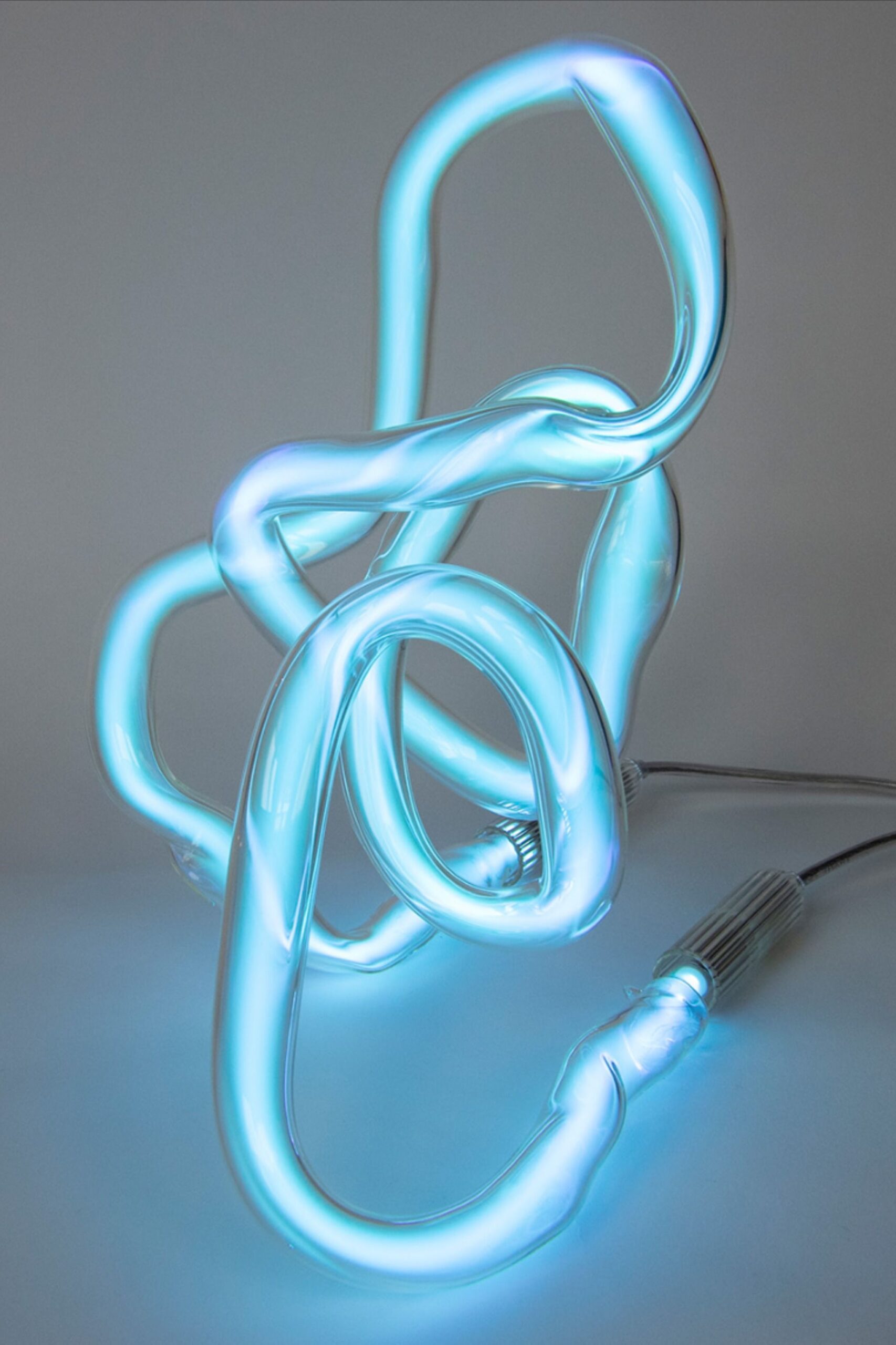 Probabilmente le più famose sono le serie di vasi, brocche e bicchieri da vino soffiati a mano. Sono tutti realizzati in resistente vetro pyrex, che li rende resistenti al calore e adatti per essere messi in lavastoviglie o in forno. Questa gamma viene lavorata con la tecnica detta “incalmo”, per cui i vari pezzi colorati vengono riscaldati e fusi insieme. Ma non finisce qua. Jochen è appassionato di lucentezza, ed è per questo che dipinge gli ossidi metallici sul vetro, cuocendoli per creare finiture molto pittoriche e iridescenti. Merita di essere accennato anche il suo lavoro con i neon, con cui l’artista esamina le possibilità dell’illuminazione scultorea. Jochen, infatti, scavalca le tradizionali lampade montate a parete e opta invece per spessi tubi in vetro borosilicato per creare forme 3D autoportanti e installazioni luminose eccezionalmente immersive.
